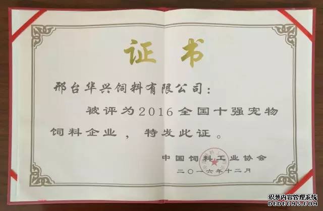 2016年12月9日,中国饲料工业协会第七次会员代表大会在北京召开,会议对2016年度中国饲料工业协会先进集体及先进工作者进行了表彰, 华兴公司荣获“2016全国十强宠物饲料企业”称号。