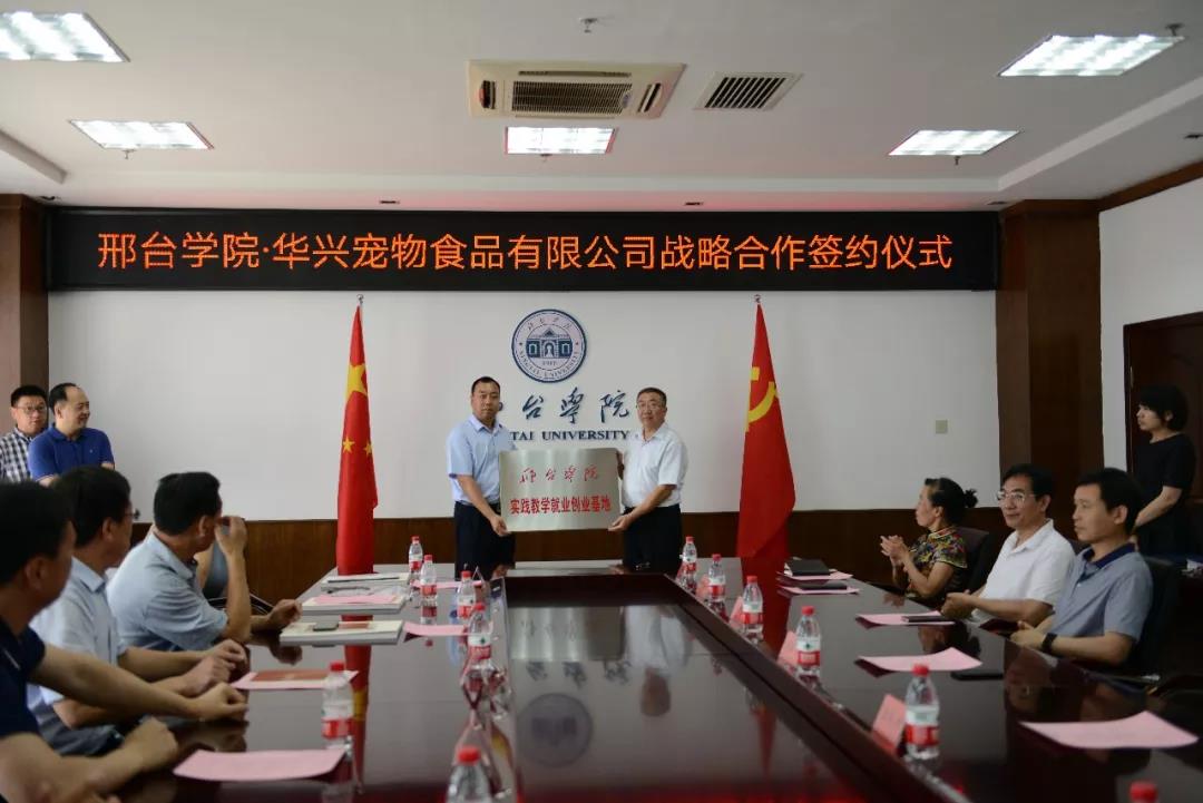 上午11时30分整,华兴宠物食品有限公司总经理冀叶军与邢台学院校长蔡振禹在战略合作书上签字,随后由蔡校长代表邢台学院进行授牌仪式,授予华兴宠物食品有限公司“实践教学就业创业基地”,标志着华兴宠物食品有限公司和邢台学院的战略合作全面开始。