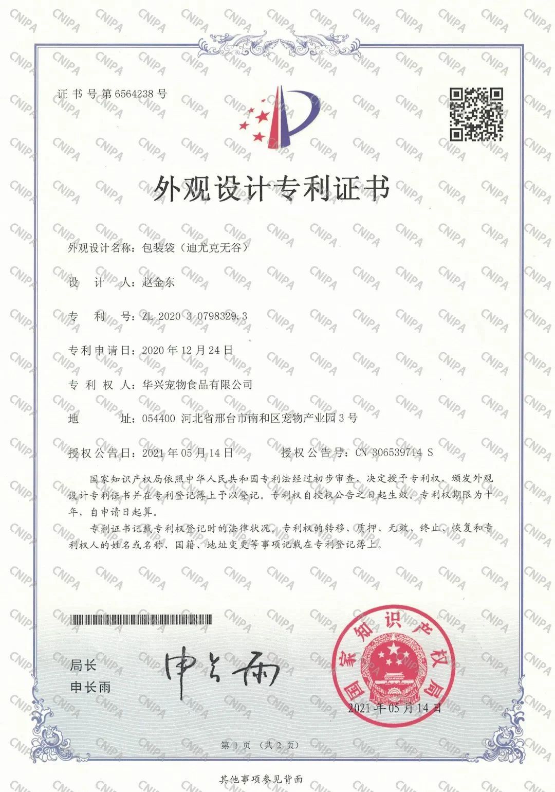 近日,国家知识产权局依照中华人民共和国专利法经过初步审查,授予迪尤克无谷包装袋外观设计专利证书,专利号:ZL 2020 3 0798329.3,并在专利登记薄予以登记。